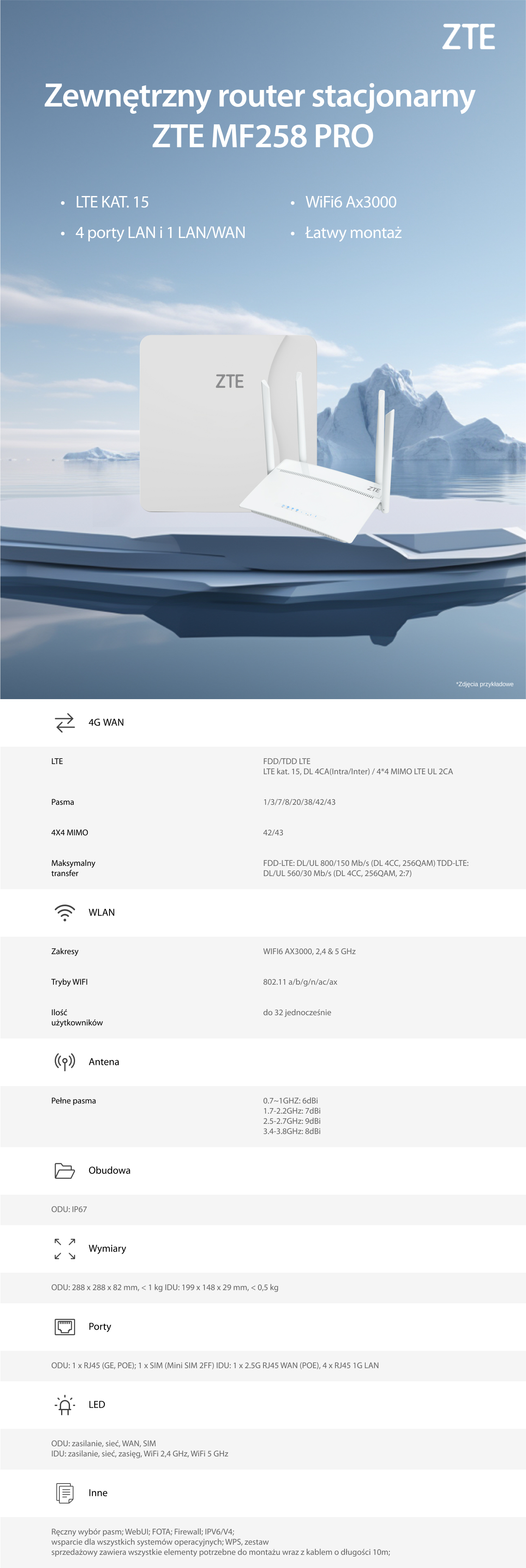 Ręczny wybór pasm, ODU zabezpieczony na poziomie IP67, wbudowany serwer DHCP i NAT, firewall, VPN, zarzadzanie WEB/TR069/SNMP, zabezpieczenie przed przepięciem, obsługa 2T4R |